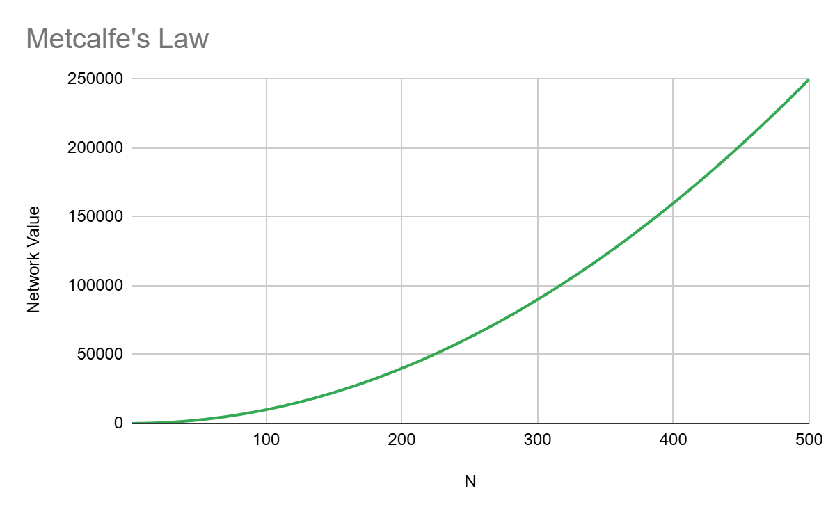 There are different laws depending on the type of network interactions. The two most prominent ones for digital networks are Metcalfe’s and Reed’s Law.