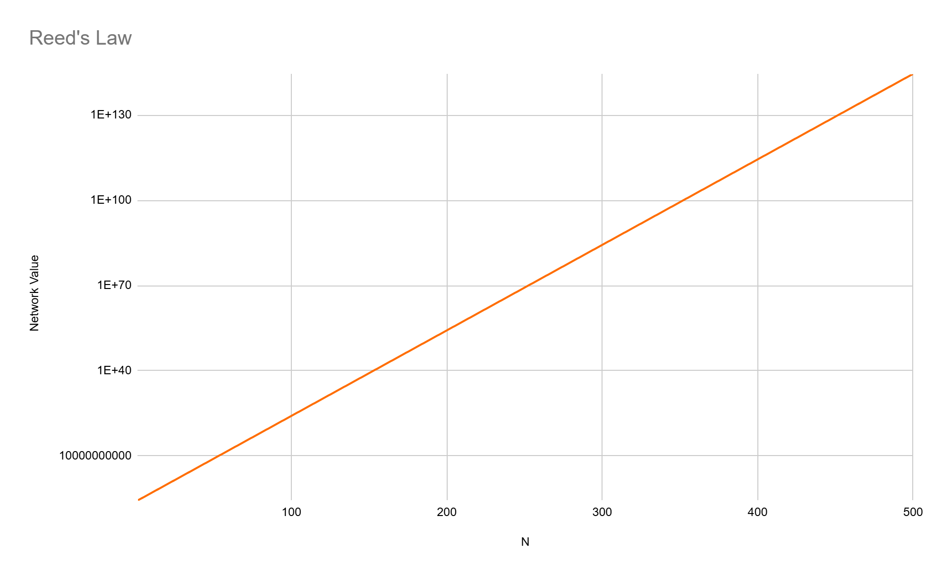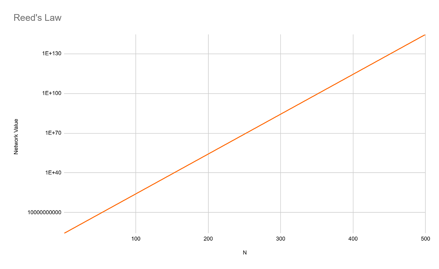 Reed’s Law: Argues that value scales exponentially (V ∝ 2N). This is for networks where users can easily form groups and subgroups (e.g., Discord servers, Reddit communities).