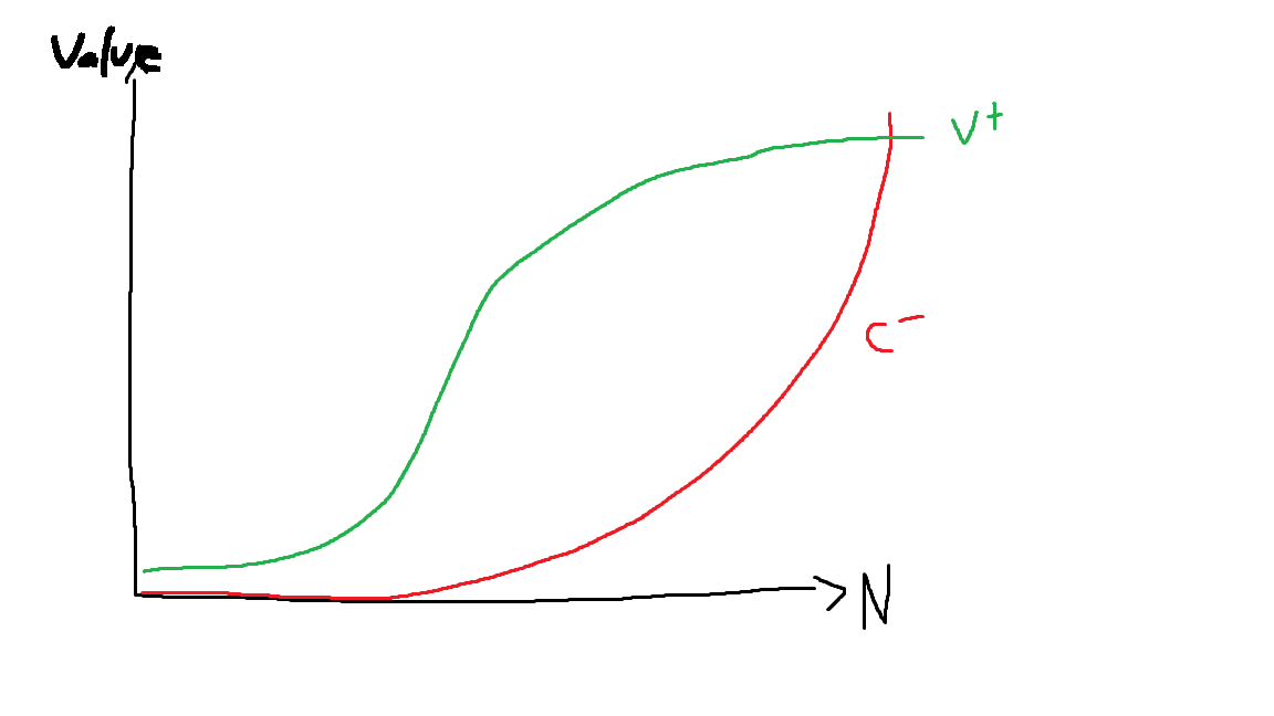 Since V+ eventually flattens while C- can continue to rise exponentially (e.g., due to capacity limits), the Net Value eventually declines, forming an Inverted U-Curve. This peak is the point of optimal network size.